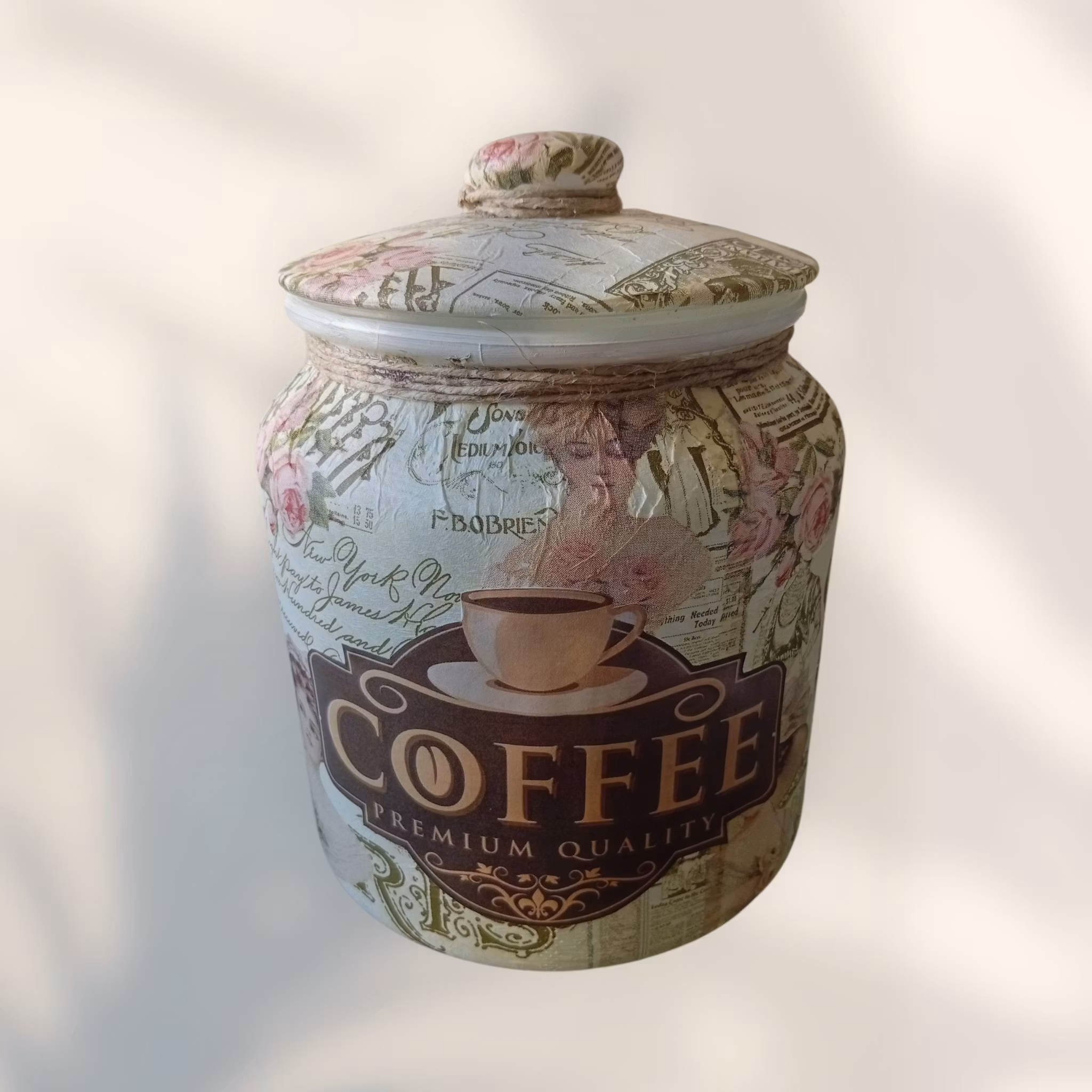 En kaffeburk i glas med lock.Decoupage runt om och ett jute snöre lindat runt.Lackad så man kan torka av den med en fuktad trasa Rymmer 1,9 liter